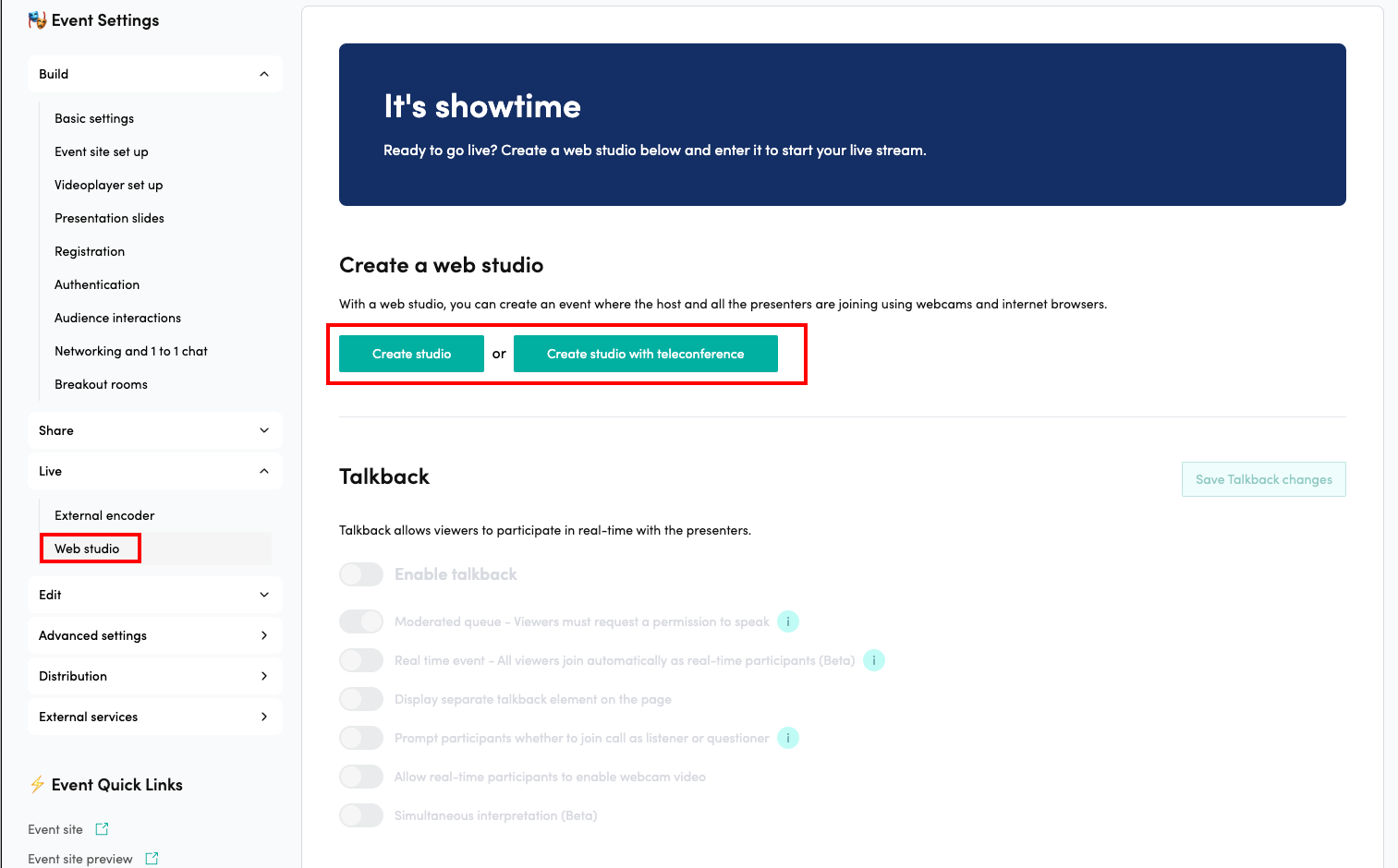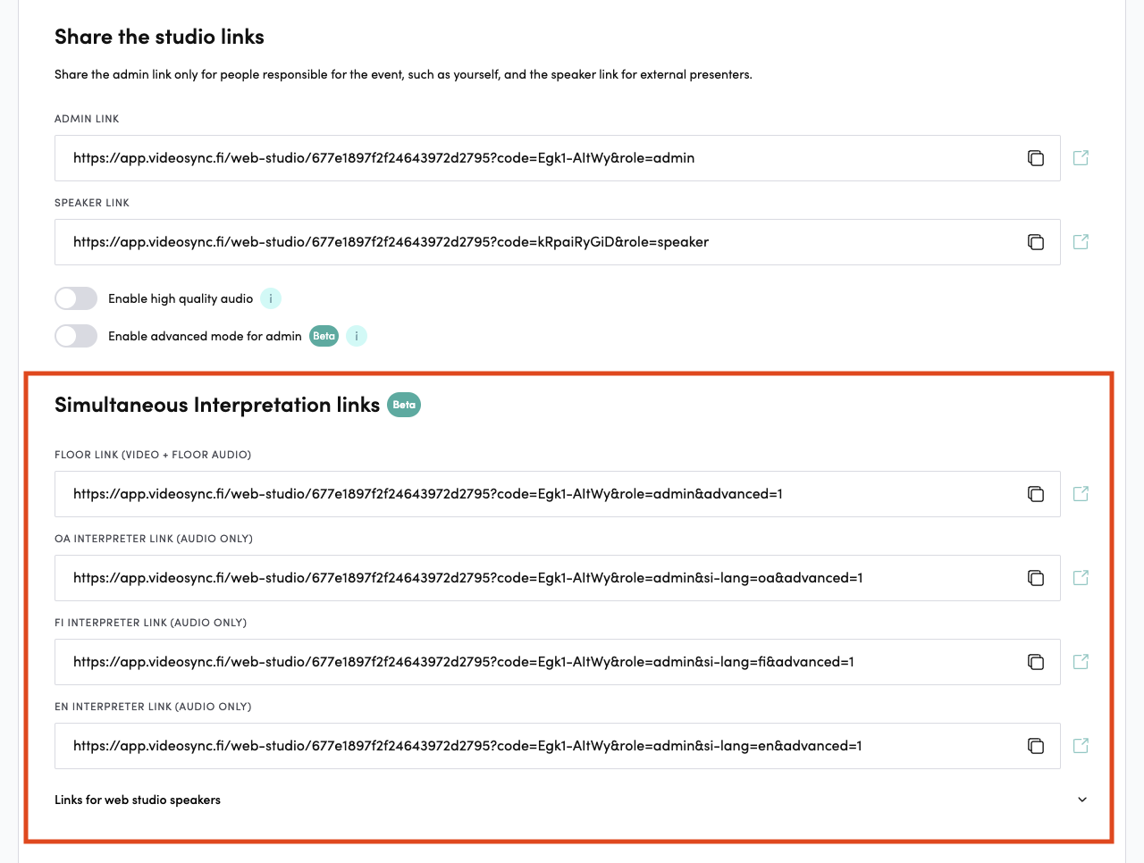 After this, when you create the Web Studio and enable Simultaneous Interpretation (Beta) under Talkback, the Simultaneous Interpretation Links will appear.