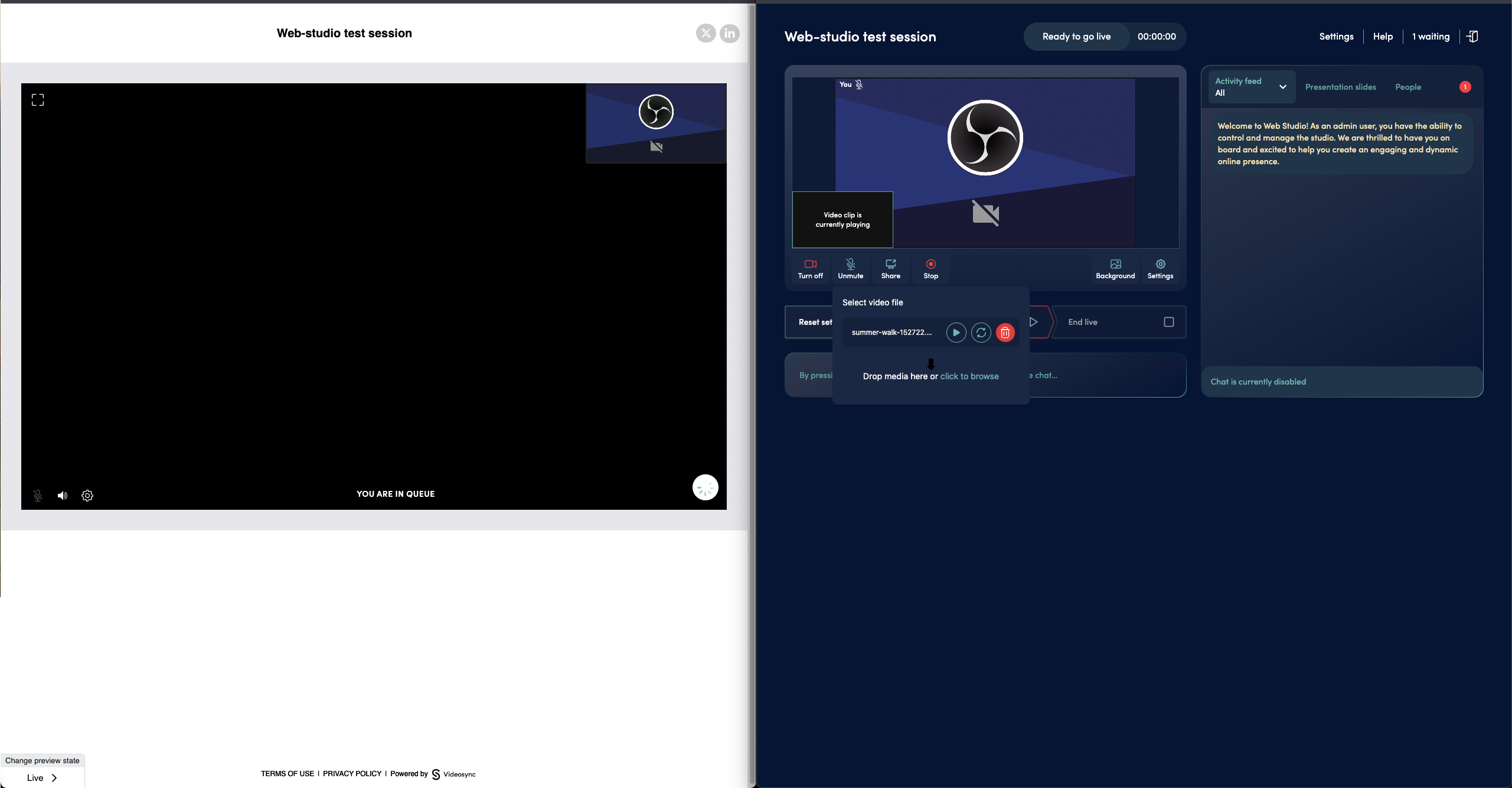 The audience can’t hear or see you yet, but you can preview your video and audio on the preview link. ( Settings → Preview link )