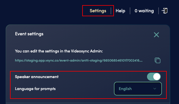 • Admin link is for event hosts or moderators to control the event