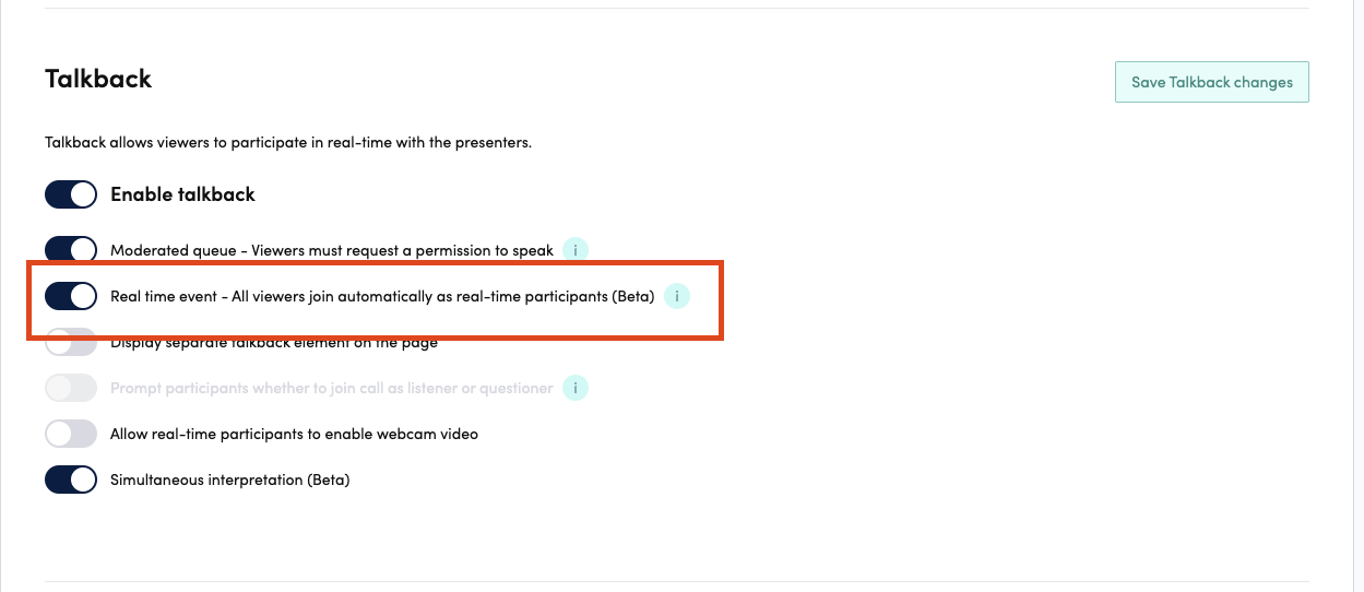 Web Studio translations setup only works in real-time stream. Meaning that the entire event is real-time (Web Studio → Talkback → Real-time event - All viewers join automatically as real-time participants).
