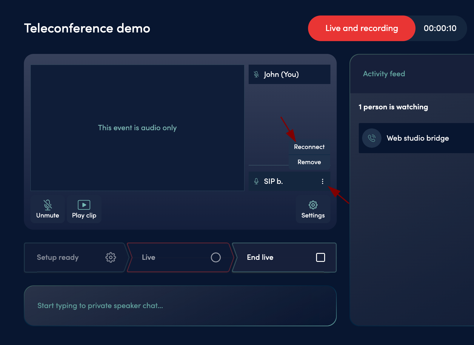 1. Locate the Teleconference bridge (labeled “SIP b.” or “Phone b.”) in the Web Studio participants list.