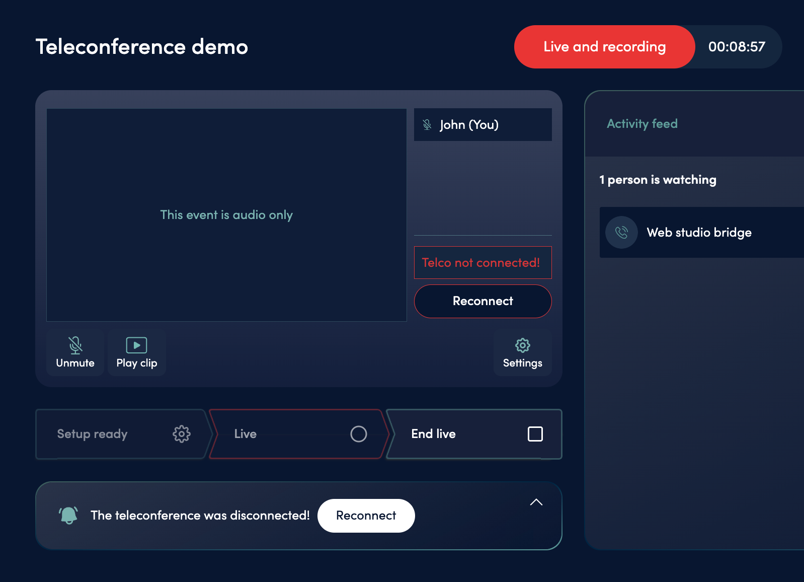 A “Reconnect” button will appear in both the Web studio speakers list and the backstage chat.