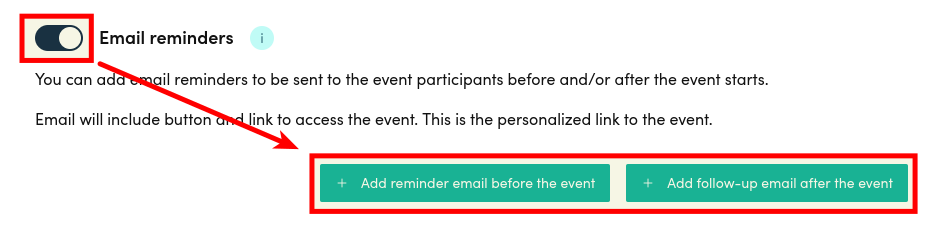 - Positive offset values (60) schedule the reminder after the publishing date You can add reminders by enabling Registration ⇒ Email settings ⇒ Email reminders, and clicking Add reminder email before the event or Add follow-up email after the event.