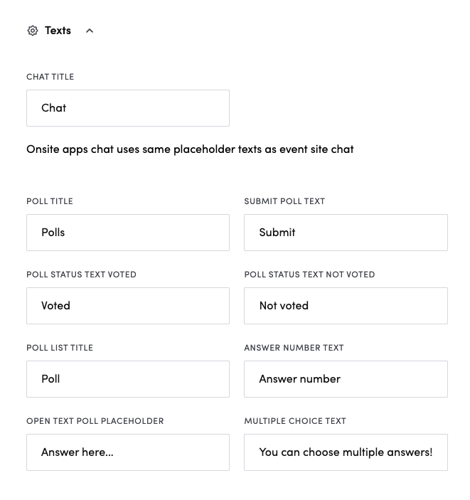The Onsite app settings also provides a “Texts” menu that allows you to change the visible texts withing the onsite app, in case you want to translate the texts to a different language, for example.