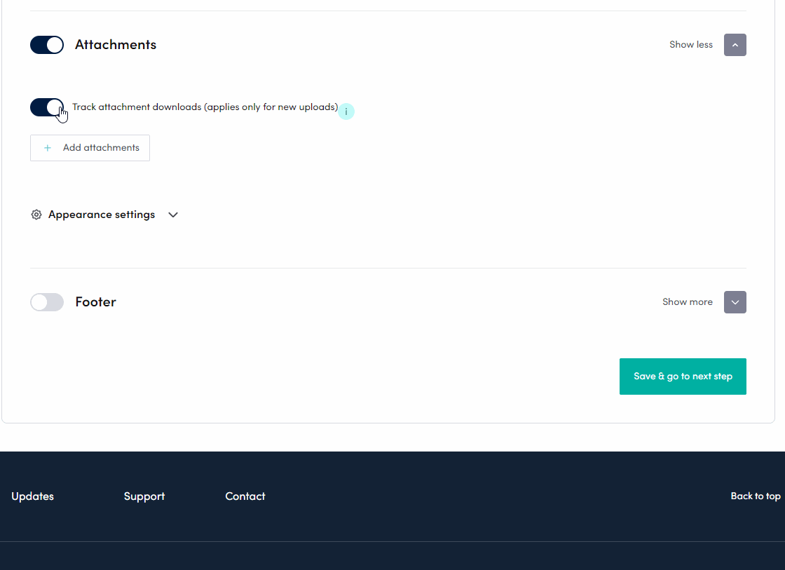 - If you want to track, which participants have downloaded attachments, set Track attachment downloads toggle on and click save (note that this currently applies only for attachments that have been added after this toggle has been set on). If this toggle is on, each attachment download can be found from the Dashboard. See How to use analytics dashboard for further info about the analytics.
