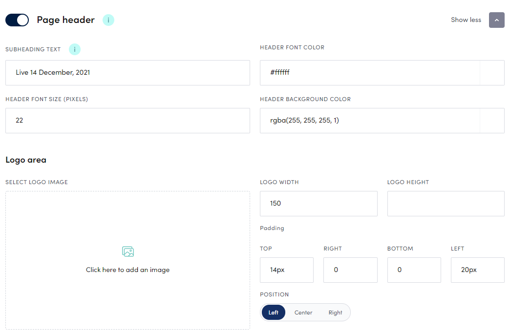 Page header is the area on top of the event site, typically used for event organizer logo and event title. Remember to set the toggle on, if you want it to be visible in the event site.