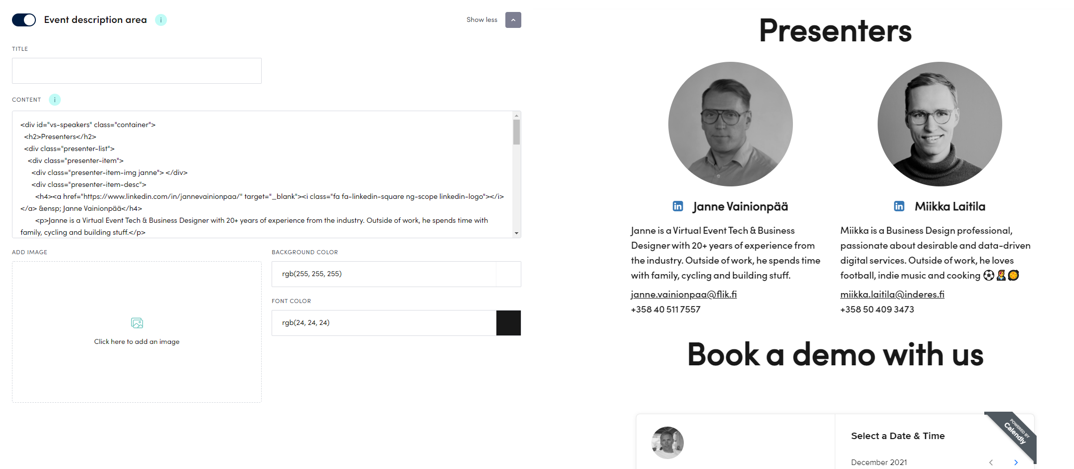 Event description area is basically a free content area, where you can have just a simple event overview, or more complex content. In the sample below, this area has been used to show presenter bios and a Calendly book-a-meeting form.