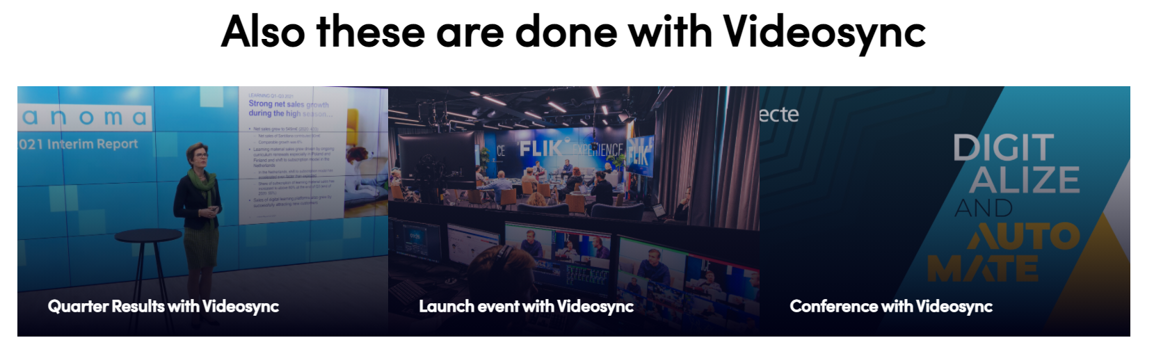 Link grid is a handy way to add links to content related to the event - blog posts, articles or call-to-actions. Links can include an image as well as a description text, and in Videosync there are different look and feel templates for this module. Number of links, and number of links in one row can be easily adjusted from the settings. Example of a link grid area in action below.