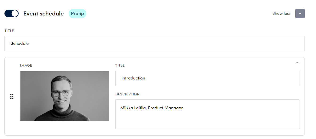 - TITLE field just below Event schedule headline refers to the section title, which is shown as a header to this area in the event site